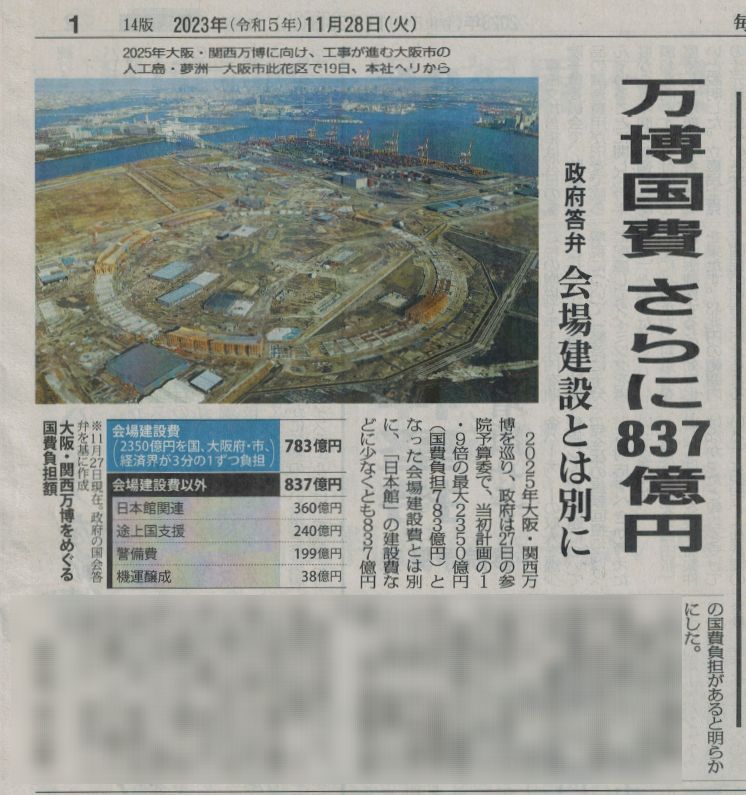 @072_sakai#2350億円に膨らんだ会場整備費とは別に、#パビリオン「日本館」の建設費用や途上国の出展支援などとして国の負担が #約837億円に上ると明らかにした。#万博費用は総額3187億円の計算となる。 万博、国の負担さらに837億円 総額3187億円、野党批判(共同通信) news.yahoo.co.jp/articles/c2680… 馬鹿にするな