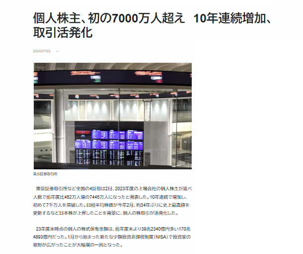 @Axel_Nico個人株主、初の7000万人超え 10年連続増加、取引活発化 tokyo-np.co.jp/article/337437 <2023年度の上場会社の個人株主が延べ人数で前年度比462万人増の7445万人になった>