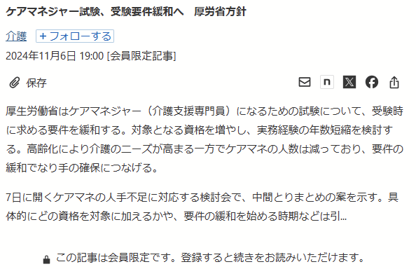 @RTNK20220627受験資格の要件緩和へ ケアマネ検討会中間案(厚労省)(福祉新聞) news.yahoo.co.jp/articles/db926… 要件緩和したらケアマネの質が下がる それより高額で時間のかかる更新研修がネック 今後、さらに高齢社会は進み 認知症の人もどんどん増えてくる 質の上がる施策を検討してもらいたい
