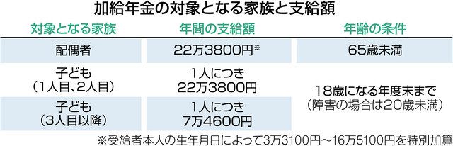 | 厚労省が年金受給者の子の加算拡充案 配偶者加給年金は縮小へ 厚生労働省は3日の社会保障審議会年金部会で、家族を養う厚生年金受給者に加算する加給年金制度のうち、18歳未満の子どもがいる場合の加算額を引き上げる… (出典:) |