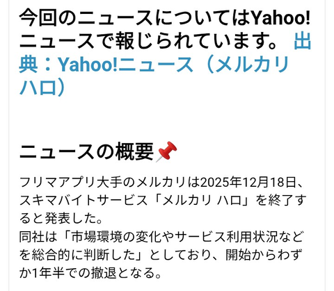 | メルカリ、スキマバイト撤退 「メルカリ ハロ」12月18日終了 …メルカリは、スキマバイトサービス「メルカリ ハロ」を、2025年12月18日をもって終了する。終了理由については、「市場環境の変化やサービスの利用状… (出典:Impress Watch) |