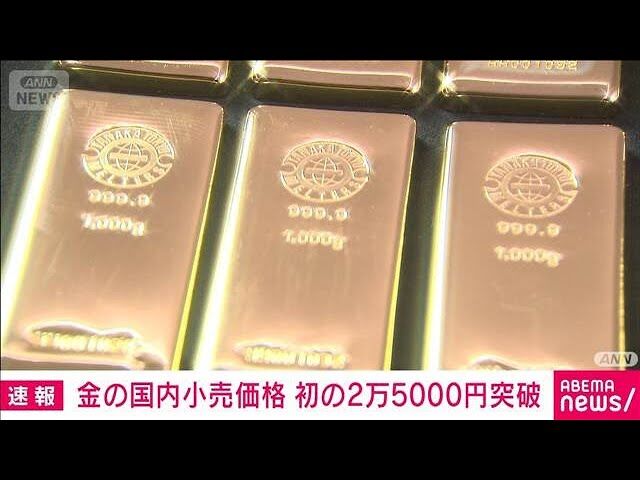 | 金価格、初の2万5000円台 3日で1000円超値上がり …金の小売価格が初めて1グラムあたり2万5000円を超え、史上最高値を更新しました。今週に入り、3日間で1000円以上、値上がりしています。 国内の小… (出典:日テレNEWS NNN) |